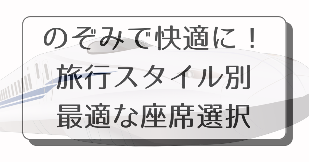 また、一人でリラックスしたい時、お子様連れの家族旅行、または友達や同僚とのグループでの旅行にも、誰と一緒かによって最良の座席が異なります。この記事では、新幹線のぞみでの座席選びのメリットとデメリットを具体的に説明し、旅をもっと快適にするための座席の選び方をご紹介します。ぜひ参考にしてみて下さいね。