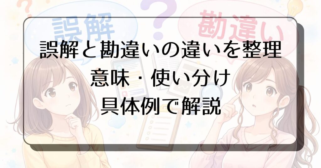 誤解は「伝え方や状況によって意味がズレた状態」、勘違いは「本人の思い込みや理解不足による取り違え」です。