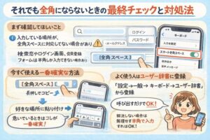 iPhoneで全角スペースがうまく入力できなくても、原因と対処法を順番に確認すれば安心して解決できます。