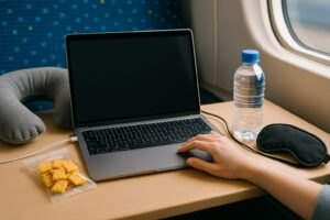 9号車をさらに快適に楽しむなら、ちょっとした工夫も役立ちます。窓側席では充電しながら作業できるので、パソコンを使う方におすすめです。