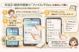 一方で「開き方」を知りたい場合は、まずファイル管理アプリ(Files/ファイル/マイファイルなど)を見つけるのが近道です。