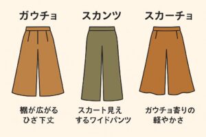さらに、ガウチョやスカンツなど似た名前のパンツも増えてきて、選ぶときに迷いやすいところでもあります。こうした似ているアイテムが増えるほど、ちょっとした違いが分かるだけでおしゃれの楽しみ方がぐっと広がるんですよ。